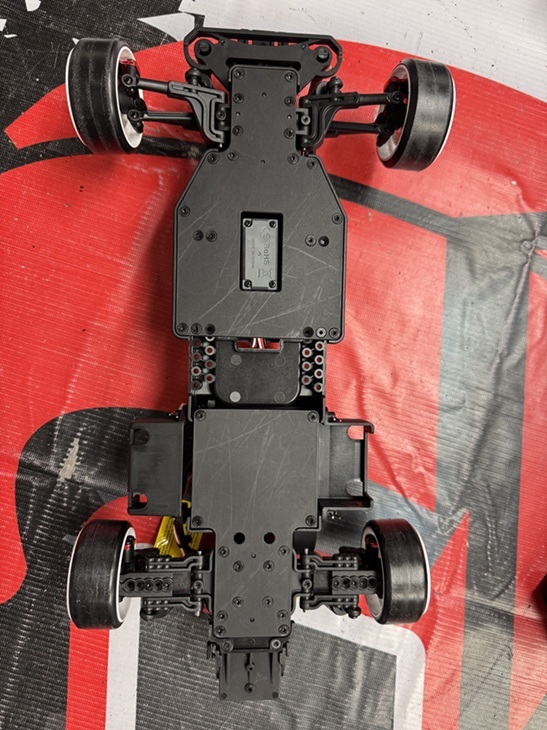 The resin main chassis is split into front and rear sections, and the connection points can be changed to adjust the wheelbase to suit the body being mounted.
